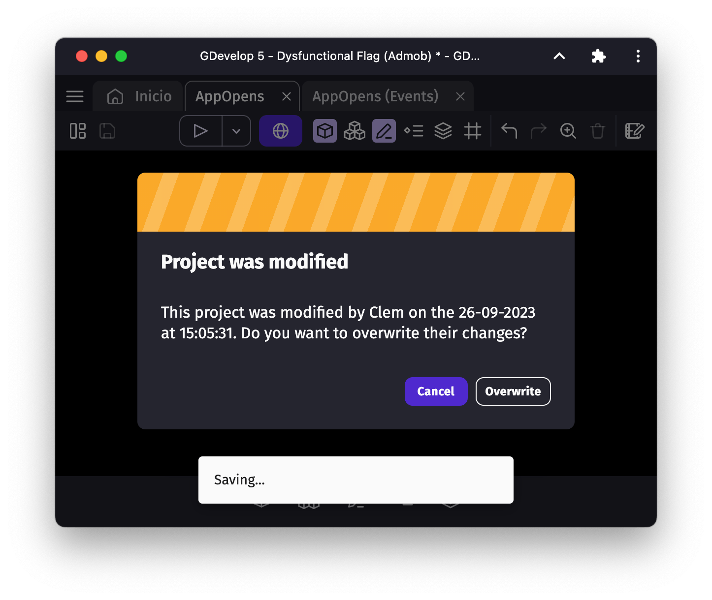 GDevelop will never prevent you from opening a shared project, even if someone else is already editing it. To prevent losing any work, GDevelop will warn you if you try to save a project that has been modified by someone else since you opened it.