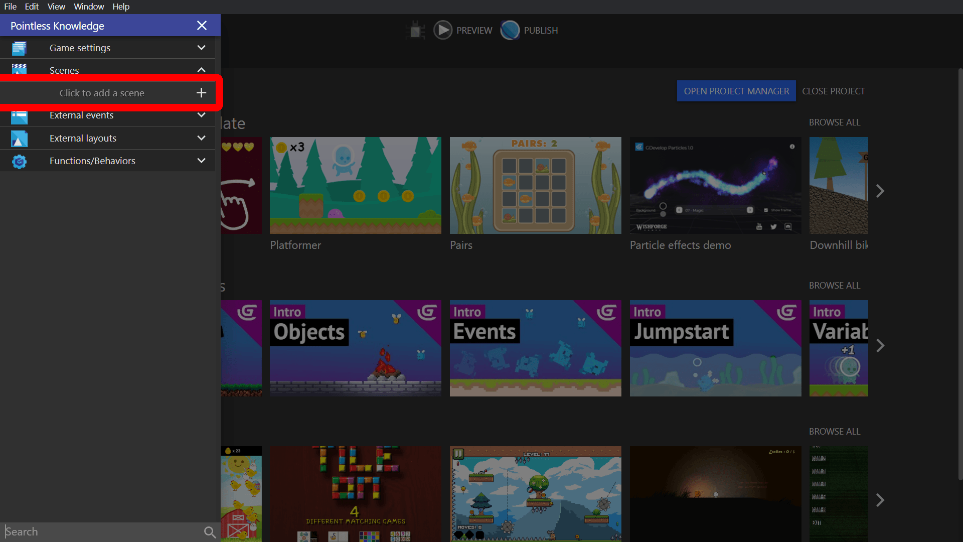 Add a scene by pressing on the highlighted button in the image below. Right click on that scene to rename it. Then left click on the scene to open it.