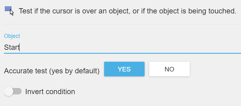 For our first condition, we want to detect whether the cursor is over the Start button. To do that, we need to add a condition. Click on Add a condition and search for the Mouse and Touch category. Choose The cursor/touch is on an object condition and select the object this condition corresponds to. It's the Start object, in this case.