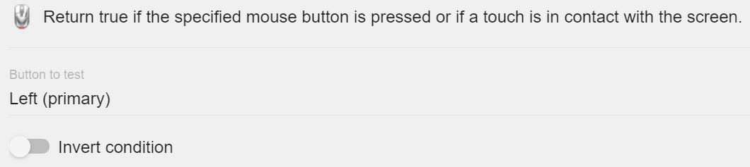 Similarly, add another condition to detect a mouse button press. Click on Add a condition and search for the Mouse and Touch category. Choose the Mouse button pressed or touch held option and select the Left(primary) button to test.